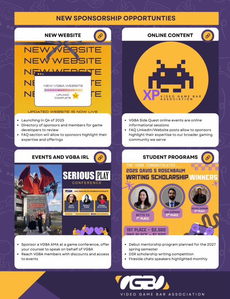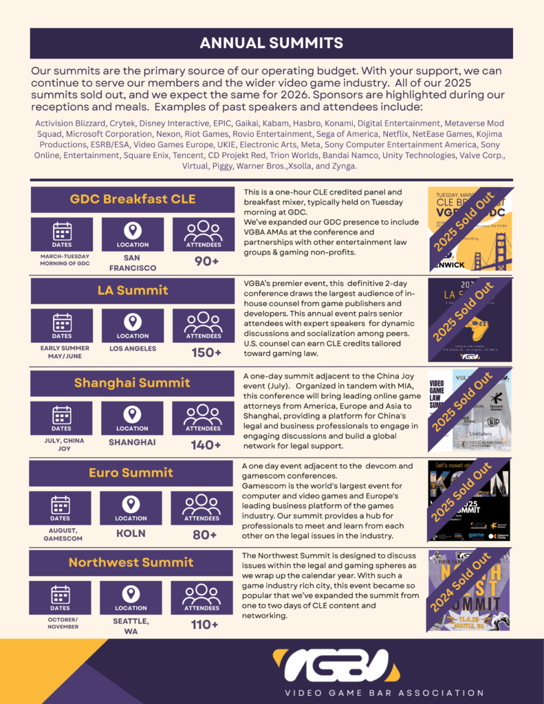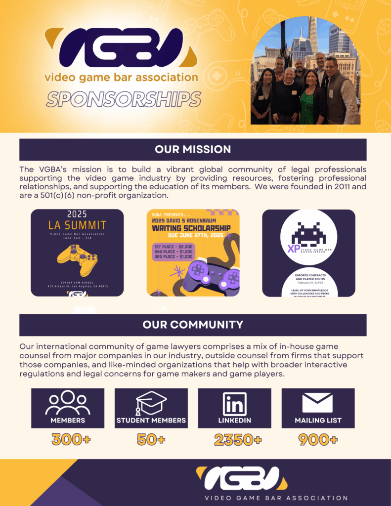 The VGBA’s mission is to build a vibrant global community of legal professionals supporting the video game industry by providing resources, fostering professional relationships, and supporting the education of its members.