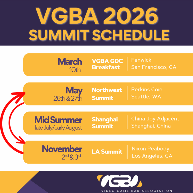 This is the VGBA’s Premier Event. Our LA Summit is the definitive conference for international practitioners of interactive entertainment law. Swapping to the fall for 2026, this event draws the largest audience of in-house counsel from game publishers and developers. Attendees can earn tailored CLE credits specific to the video game industry.