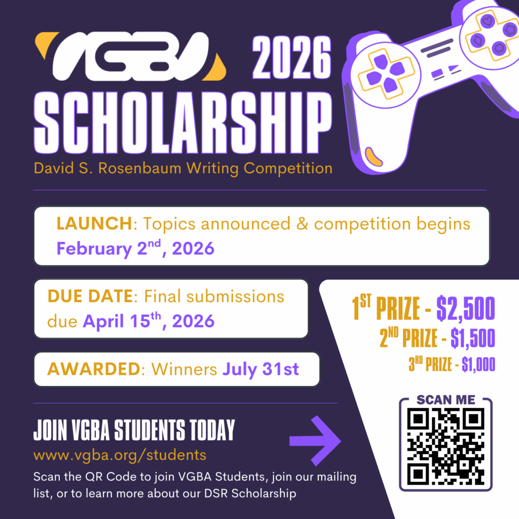 The goal of the Video Game Bar Association David S. Rosenbaum Writing Competition is to encourage and reward law students interested in the field of interactive entertainment law.