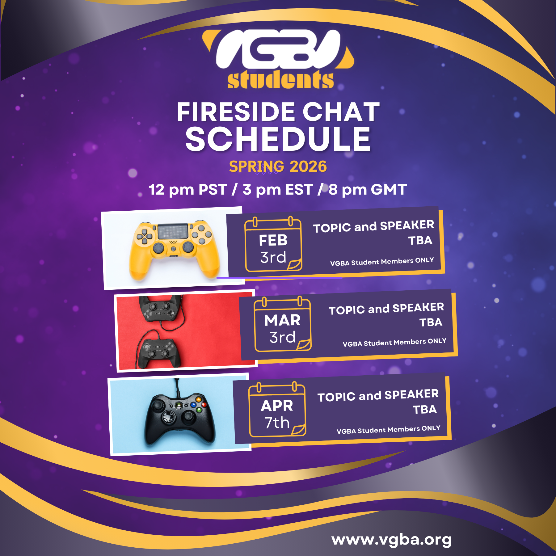 The VGBA Fireside Chats are a monthly initiative that puts students in a more intimate, conversational setting with working professionals in the video game industry. The first fireside chat is available to all who are interested, while the concurrent fireside chats will be open only to student members.